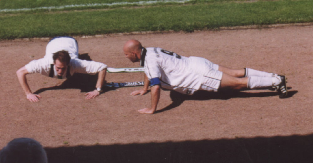 Nach dem Spiel gab es noch unzählige La Ola Wellen zusammen mit Trainer und Mannschaft. Patte musste vor der Haupttribüne noch 40 Liegestützen machen, wobei ihm die Stimmungskanone im Motorteam, Matthias Schilling, noch 20 davon abnahm. Anschließend ging es weiter zum Motor-Biergarten, wo die gesamte Mannschaft, Trainer, Betreuer und Fans in geselliger Runde beim Grillen zusammen saßen und der ein oder andere Spieler mit Sprechchören gefeiert wurde. Und das Motor-Team machte jeden Spaß mit! Einmalig !