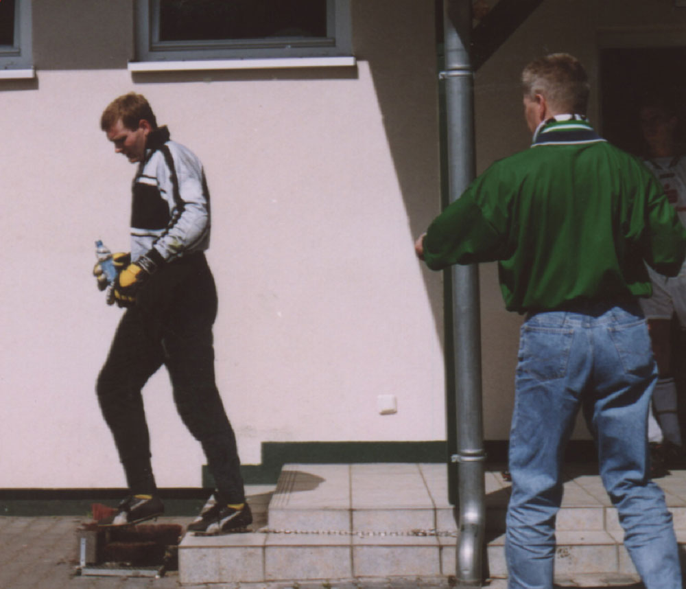 Alt vom Fass und gute Stimmung. Zu später Stunde wurde noch auf den Tischen getanzt. Gut gefüllt machten wir uns um 03:57 Uhr auf dem Heimweg. Natürlich durfte der Besuch einer Dönerbude auch nicht fehlen. Einige Leute aßen ihren Döner vom Hemd, Hose und Tisch. Egal, Hauptsache lecker! Um 05:00 Uhr lagen wir platt im Bett. Der Tag X war also schon lange angebrochen. Unser Sonderzug nach Eberswalde fuhr schon um 10:00 Uhr ab. Glücklicherweise hatte Patte den Weckdienst übernommen und schmiss uns um 8:45 Uhr aus den Federn. Laut Patte sollte der Fußweg zum Bahnhof 20 Minuten dauern. Um 09.30 Uhr saß unser Vize-Präsi immer noch am Frühstückstisch und ließ es sich gut gehen. Erst nach Pattes Hinweis, dass es nun aber Zeit wird, kam unser Vize-Präsi in Bewegung. Im halben Dauerlauf marschierten wir zum Bahnhof. 120 Sek. vor Abfahrt des Zuges kamen wir an. Kommentar vom Vize-Präsi: „Siehste, reicht doch!“