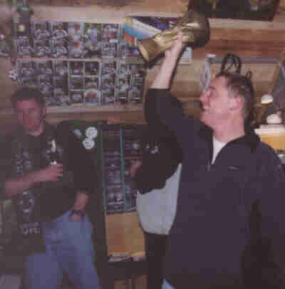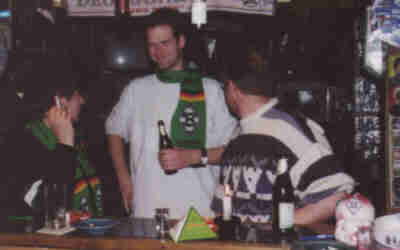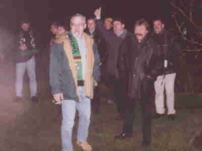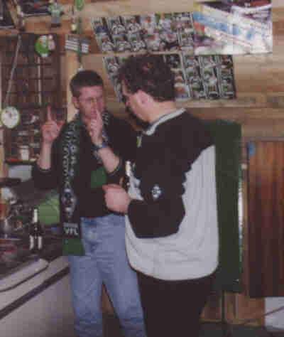 31.03.2002 Bunte Eier empfingen uns an diesen Sonntag Vormittag. Doch dieses „B“ war es nicht das an diesen Tag für Begeisterung sorgen sollte. Nach einem ausgiebigem Frühstück war Bulli fahren, Bier trinken und Borussia angesagt. Schon auf dem Hinweg fieBerten alle nicht nur dem Spiel sondern auch auf den ABend des „B’s“ entgegen. Blöde Sprüche wie „Frauen können keinen Bericht schreiBen, Fahrt ohne Bunte Eier (die Männer wollten ihre nicht opfern) usw. konnten wir uns den ganzen Tag anhören. Endlich Begann das Spiel, interessant wie Eier suchen wo keine versteckt sind. Doch kurz vor Schluss der erlösende Elfmeter. Glück gehaBt. Auf der Heimfahrt stieg die Spannung wieder an. In Schüttorf angekommen, ging es nach einem kurzen Stopp an der DönerBude zum Osterfeuer und von dort direkt zum Fohlenstall, wo Bereits das „B“ den ganzen Tag auf uns wartete. Michael hat das EmBlem von Borussia in ca. 1,80m Größe aus Holz und Lichtschläuchen geBastelt und dieses auf dem Dach des Fohlenstalls Befestigt. Nachdem alle in seinem Garten versammelt waren, von 10 aBwärts gezählt wurde, erschien Bei Null das riesig, jetzt Beleuchtete „B“ auf dem Dach. Zur Freude aller, wurde dieses mit Borussen-Sekt (den wir am Nachmittag Besorgt hatten) Begossen. Die anschließende Einweihungsfeier wurde dann auch zu einem feuchten und sehr spaßigem Ereignis. ABer wer glauBt es giBt in der nächsten Zeit im Fohlenstall nichts mehr einzuweihen, der irrt sich gewaltig. Für die nächste Einweihung sind Bereits Vorkehrungen getroffen worden. Die B’s aus der Feder der Philosophin – Hille Venhaus