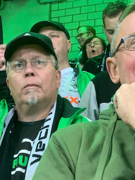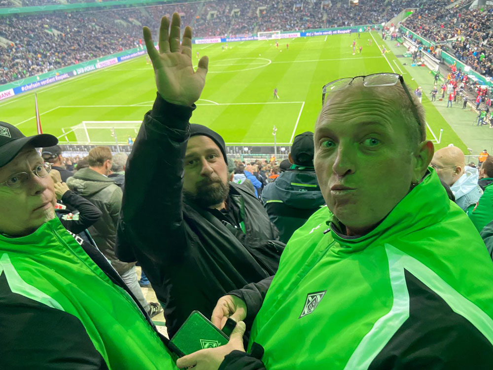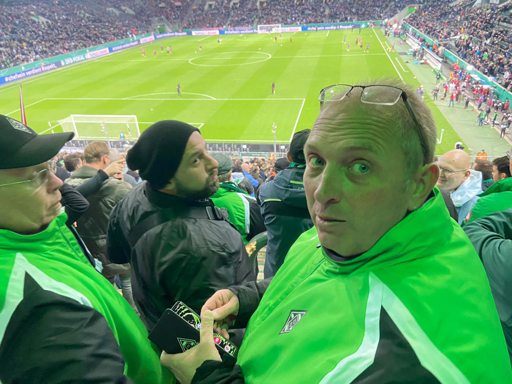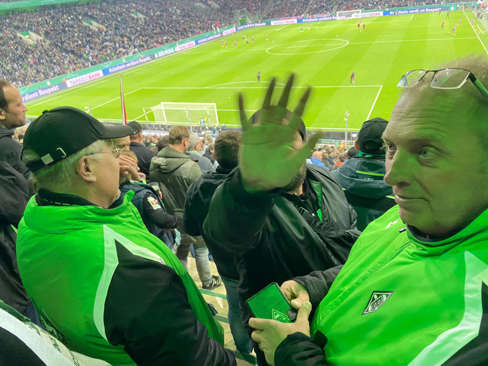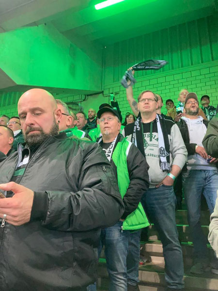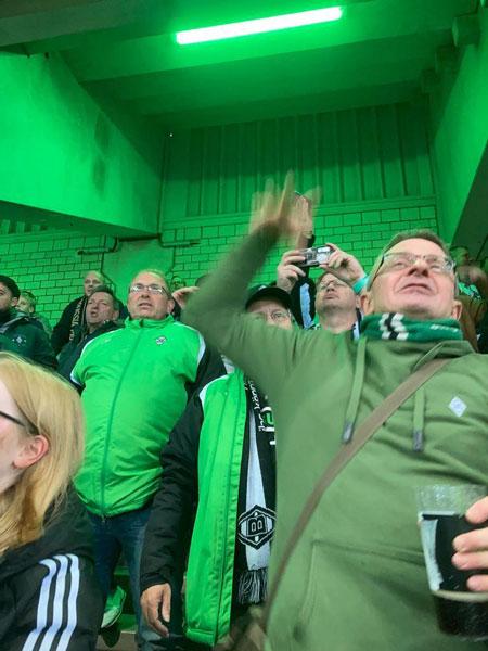 Der Präsi hatte keine Maske dabei, Bomber besorgte erst eine Gebrauchte „Kannste ja auf Links ziehen.“ Da hatte ich schon den Verdacht das der Gummibärchensaft irgendwie obergärig war… Nachdem ein Freund und Helfer – nicht Frank – eine Maske über hatte, konnten wir ins Stadion, dort trafen wir dann auch Stefan.